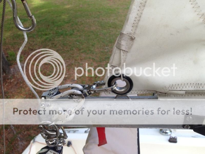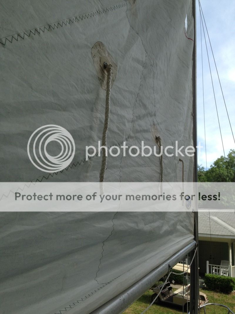 As regards sail shape (bagginess, etc.), in both pics, it simply appears that the sail is not correctly tensioned along the luff and along the foot. The pic with you sailing the boat shows that you dont have proper luff tension (the aft end of the boom seems much lower than the tack ... not enough luff tension). Go to http://forums.sbo.sailboatowners.com/showthread.php?t=120970 and read post #1 to get the proper luff tension and then use the same description for proper foot tension (1" extra stretch per 10 ft. of foot length) 'after' a no-load stretch out. This will allow you to make a decision if those 'bolt ropes' need to be eased and reset by a sailmaker to proper length. Proper edge tension will give better/proper as-designed sail shape, especially for sailing in the higher wind ranges. Improperly raised dacron sails are ALWAYS 'baggy'.