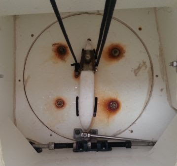 Below is a picture of the inside of the rudder cage, looking down at the top of the VARA rudder drum. The rudder is in the down position. It may be difficult to see in the picture, but the round drum in the middle of this picture is a couple of inches below the rest of the hull.