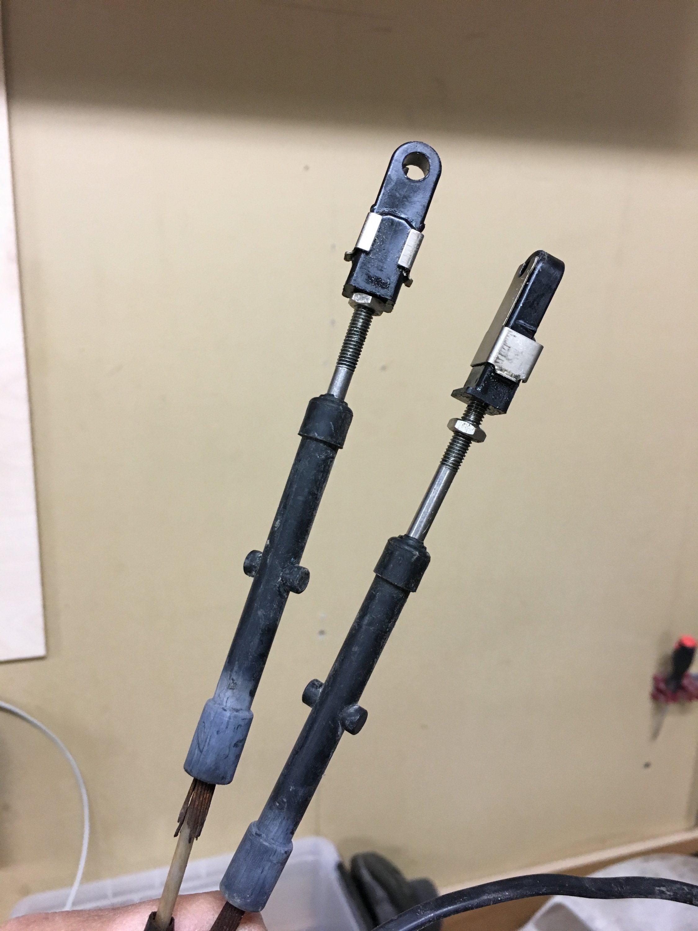 Has anyone else seen these? Do you know where I can get replacements? Are there any work arounds? The cables are about 6' long (4' would work fine) and they appear to be made by Yamaha. The throttle cable still moves very nicely so I've been considering the option of building a short manual linkage arm and just reaching back to change gears.