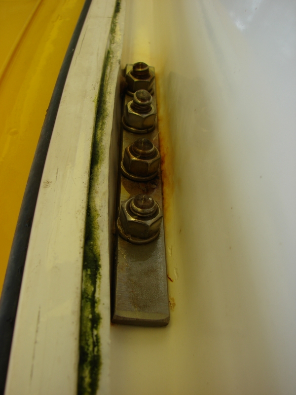 It appears that when the starboard side backing plate was installed, the installer felt the need to grind away part of the flange or lip at the edge of the hull. This apparently wasn't a problem on the port side.