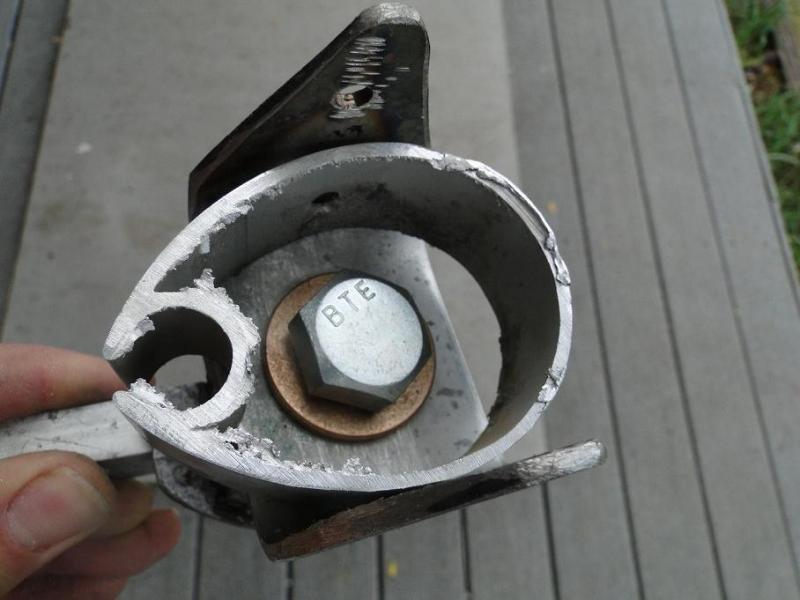Now I'm wondering how I ever adjusted the mast rake...in the original mast setup, the mast extrusion itself (and thus the weight and downthrust) must rest on the two bolts (the one thru the mast and the one thru the bracket) and not the mast bracket itself in order to change angles, or else one edge of the mast extrusion would not rest on the bracket as soon as you changed the angle...everything's not touching everything else here...:snooty: BAH! Someone help please! :eek: (LOL!)