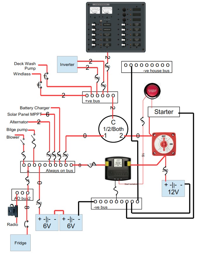 Hello. I’m redoing the mess of an electrical system starting with battery setup. I’d like to get an opinion on how I’ve laid this out, and any improvements or cautions are appreciated. My engin is a Beta Marine 60 with the starter/Alt coming from one output bolt. Thanks!