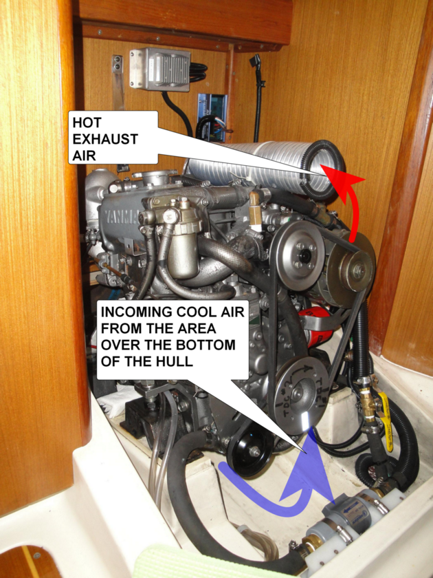 1. There would be two fans. The red hose has the squirrel cage fan with hot exhaust air. That fan is currently mounted at the back edge of the port cockpit locker where Catalina installed them, but I can look into moving it to nearer the engine.