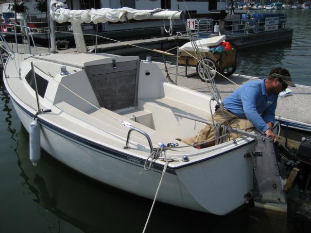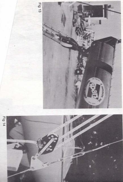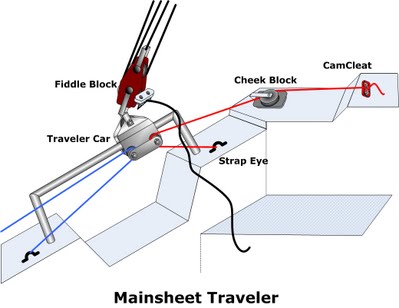 I have a 1987 Oday 222- as shown in the pictures below. The 222s came from the factory without a traveler. In order to rig the mainsheet, a fiddle block is attached to the triangular metal plate in the backstay (figure 14) and connects to a mainsheet block mounted aft on the boom (figure 13).
