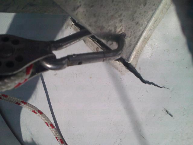 I learned of a design flaw in the location of my mast support pole. It must be directly under the mast. I changed the original design so that the companionway could open all the way by moving the mast forward about 6 inches. Unfortunatly, the mast post could not be centered under the stick. I used two pieces of thick teak as plates under thinking it would be enough. It wasnt. Check out the massive crack that presented itself to us about half way there. We got it stabilized and pressed on.