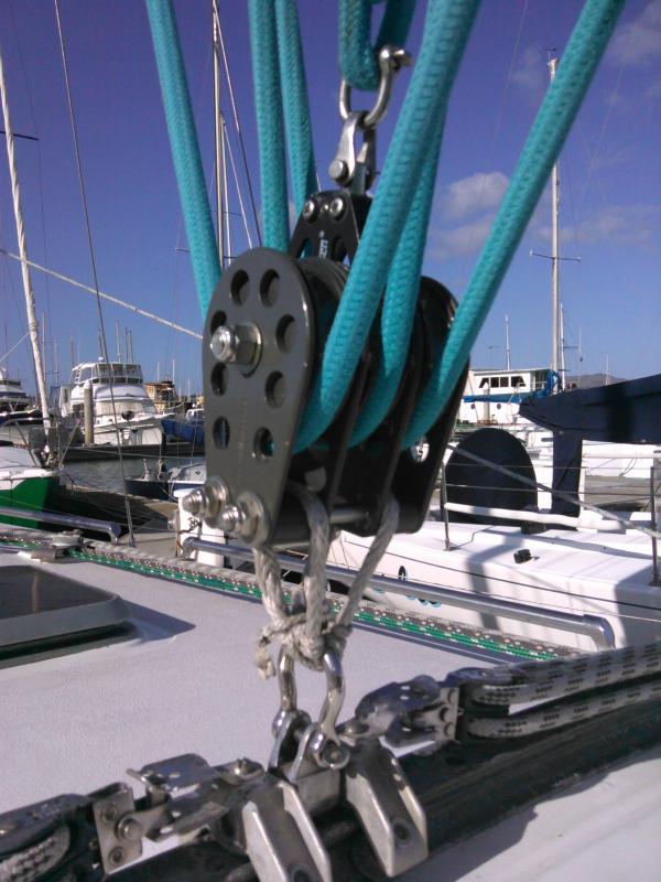 My most recent Amsteel "soft shackle" application is in the attached picture. I cobbled together unused Harken big boat low friction cheek blocks (ball bearing + roller bearing sheaves) into a triple block for my main sheet at the traveler. The 1/4" Amsteel is rated at 8600 lbs breaking strength. Should be amply strong. Plus likely even greater since the load is shared among the four turns between the "block" and the traveler. No metal shackle would have worked here. The Amsteel was the solution in this case.