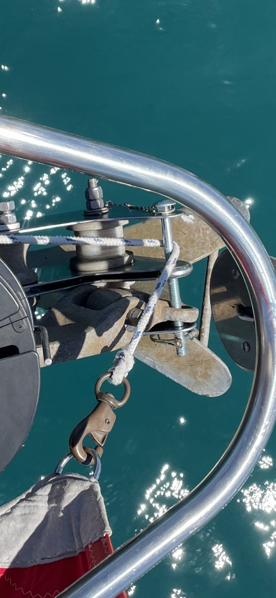 In this photo, the tack line is just routed down and under the anchor pin. Last year I added the block (which works a lot better).