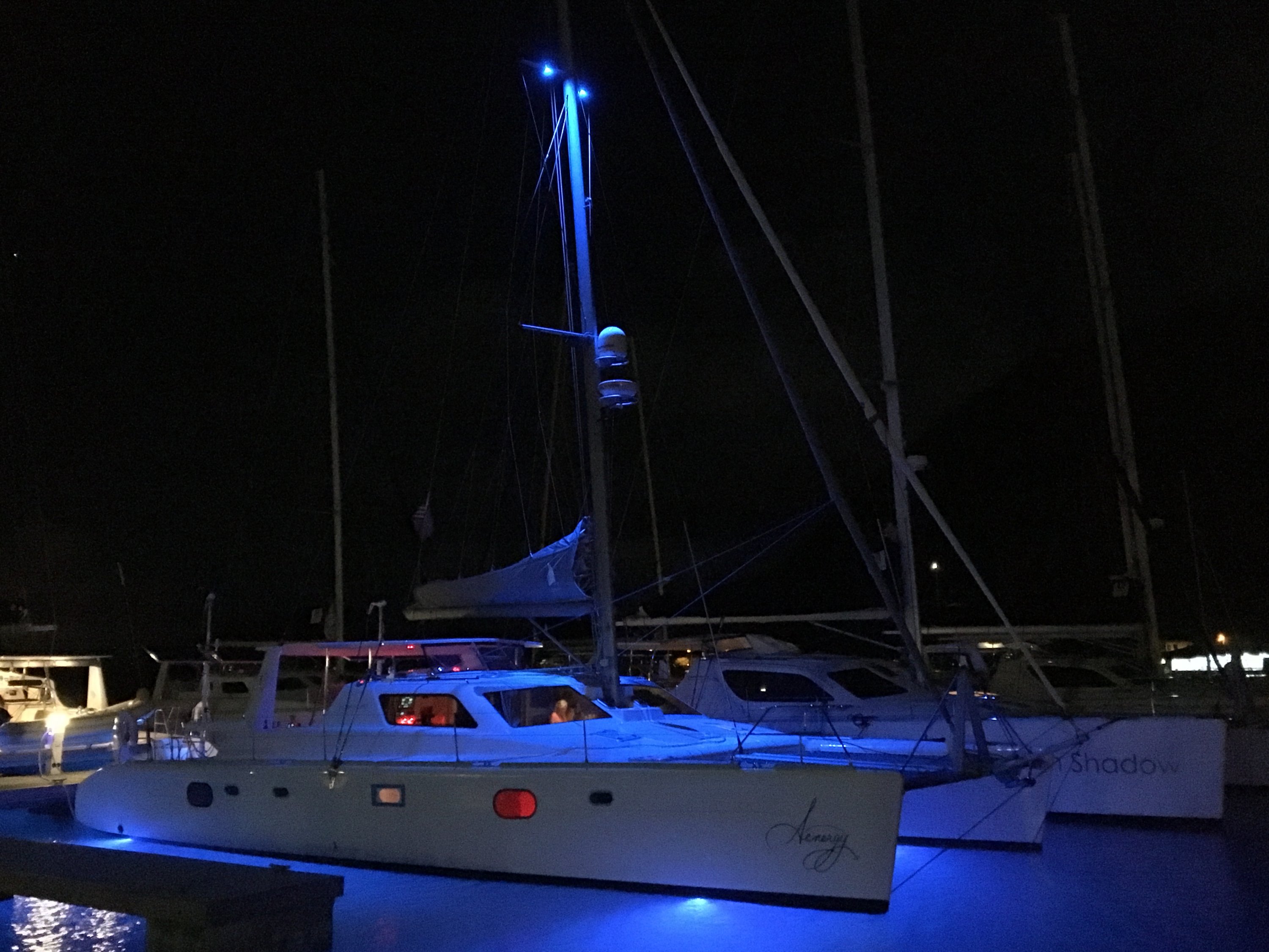 Senergy is still in Tortola getting some warranty items taken care of at Voyage Charter Yacht Headquarters. She should set out for homeport this weekend. We have window coverings......but you are looking through the galley window.....most people are clothed while in the galley tied up to the dock.....that is a member of the delivery crew, not me (I'll be in a bikini of course!)
