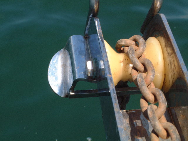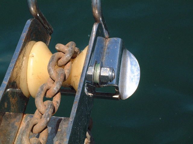 I took myself down to my local hardware store and bought a 4.5" stainless cap screw with a couple flats and a locking nut. Then I bought two shouldered bushings made of bronze that were 1/2" ID and 3/4" OD from Tractor Supply Co. These bushings were too long, so I cut them down in my lathe (everyone has one of these in their basement,right?) to have a shoulder length of 1/8". The thickness of the stainless anchor roller is 3/16", so the bushing fits in nicely and converts the 3/4" hole to a 1/2" hole. Now I can just buy standard rollers when they wear out and change them in less than 5 minutes.