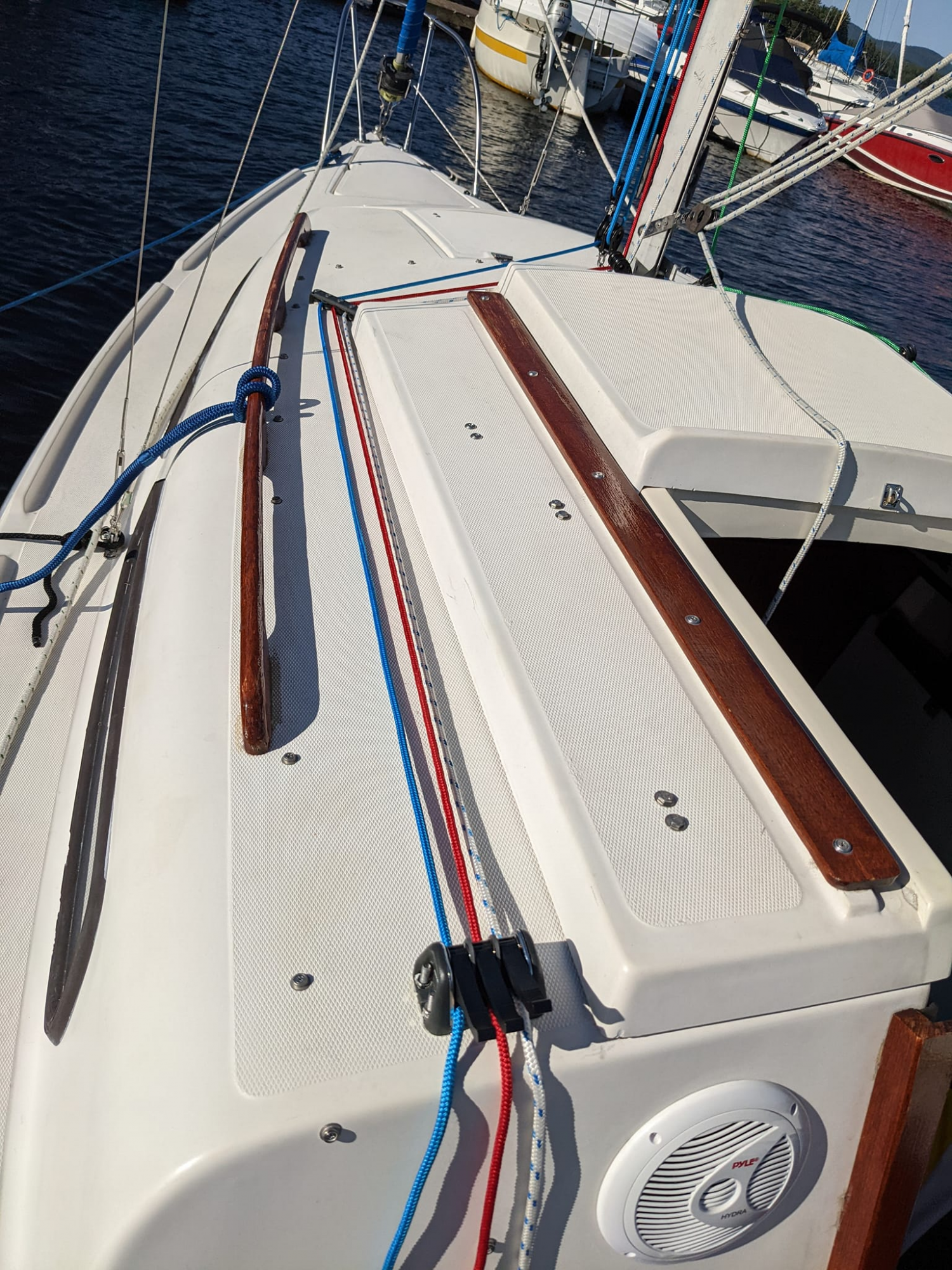 My bones are getting older and jumping around the boat the last few years has become a bit slower and more carefully footed. To make things a bit safer I'm considering addition of a cabin top halyard winch and the other necessary parts so I can raise the mainsail from the cockpit. I don't need to worry about the jib because it is furled. Does anyone have some picture examples that I could study while I consider this project? Of course it would be nice to place the winch and route the halyard so they don't interfere with the pop top tent.