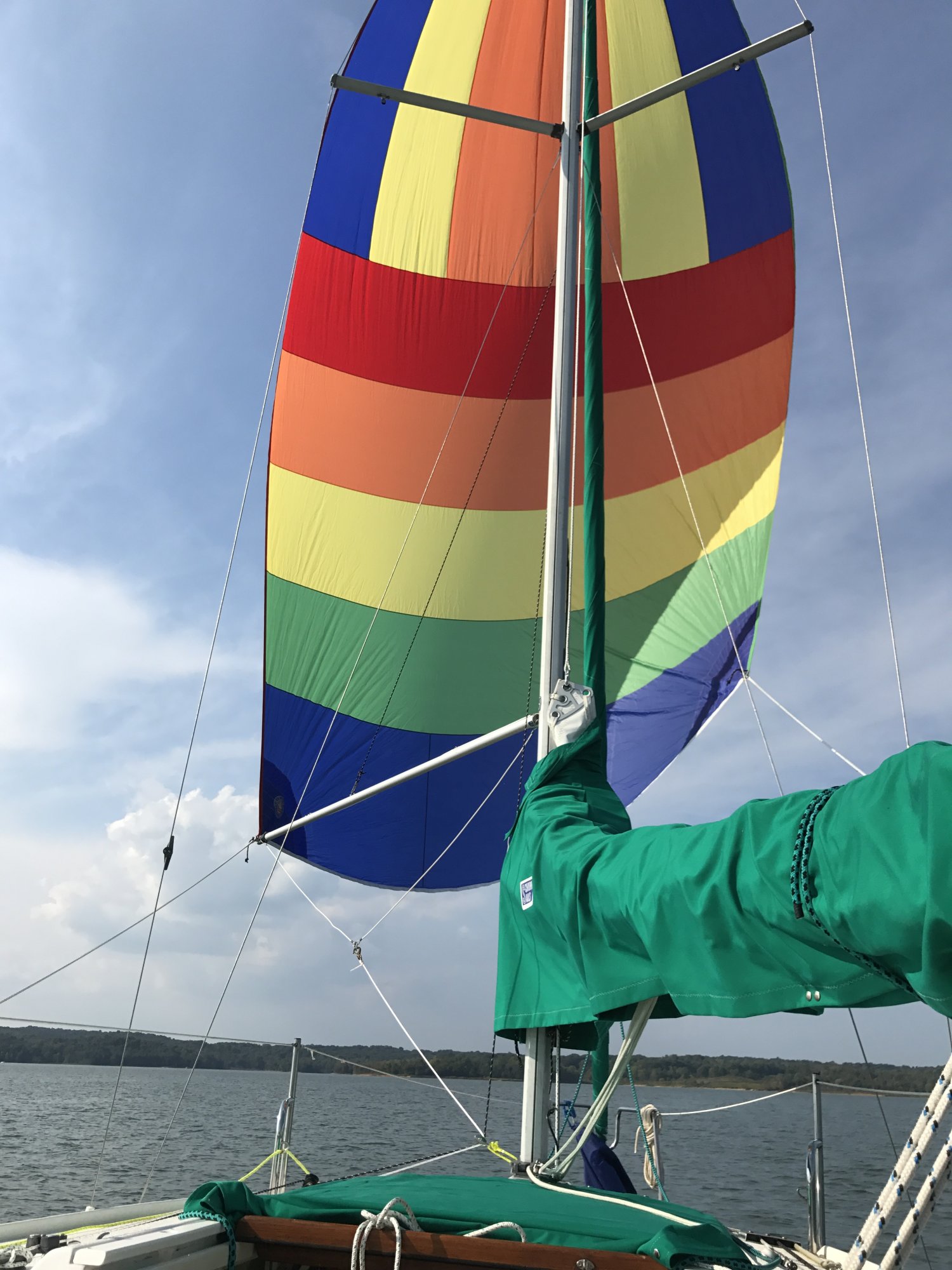 We were able to run half the length of the lake, Aqualand to Holiday Marina one afternoon. It was an hour an a half, very relaxing, calm sailing. Our jib is less than 100 square feet and I missed having a whisker poll like I had on Xin Loi. She was an 18 foot sloop that I built in high school. Than was in 1964. Your spinnaker is beautiful. It appears to be symmetrical. I haven't opened up our yet; I a guessing that is is asymmetrical.