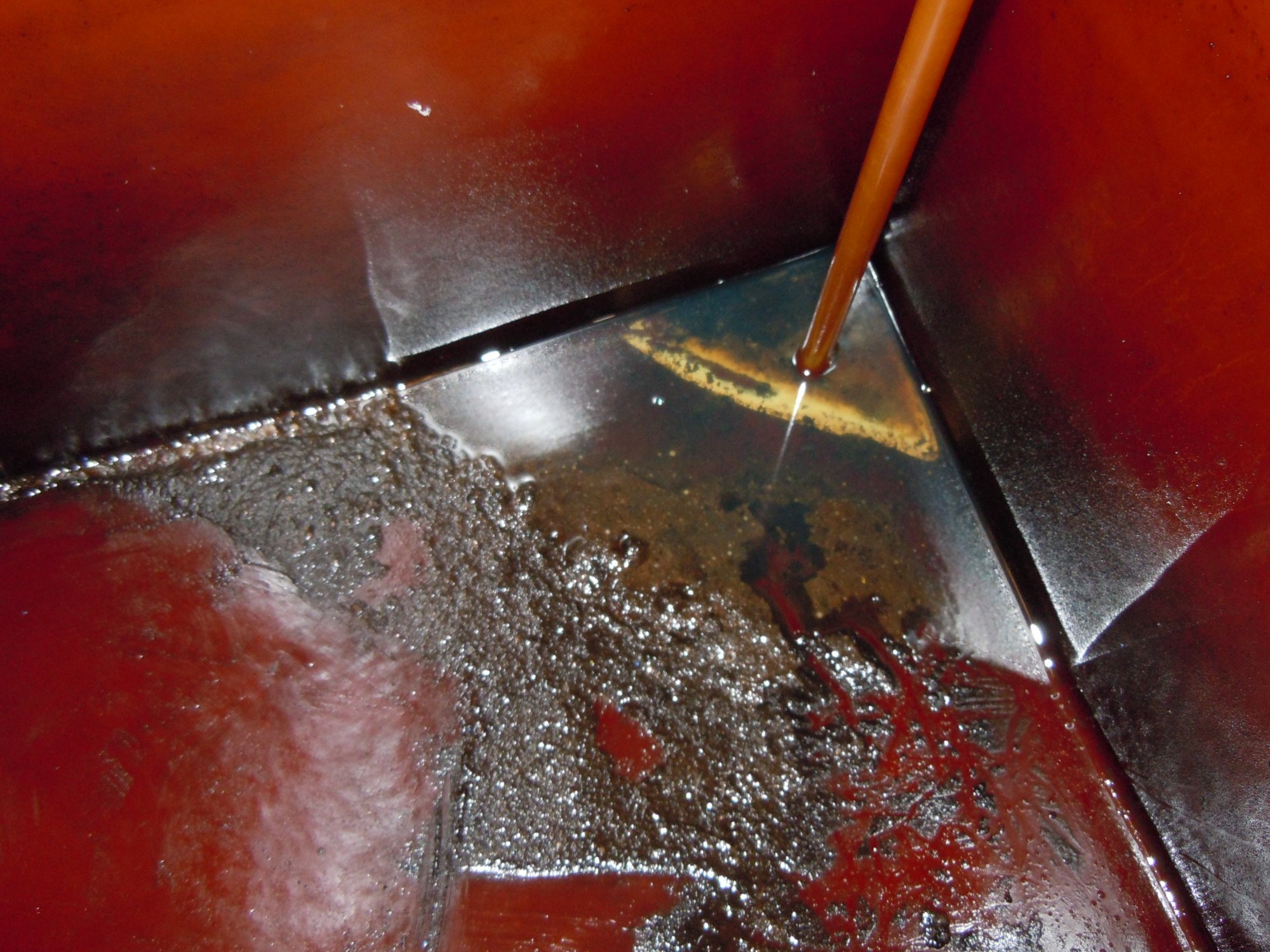 We have a 45-gallon tank. This boat has not run its engine much in about the last 10 years. We got her less than 2 years ago. We topped off the tank with a couple of gallons when we got her and are just now down to a half-tank. It let the level drop so I could get a look at the inside surface of the tank.
