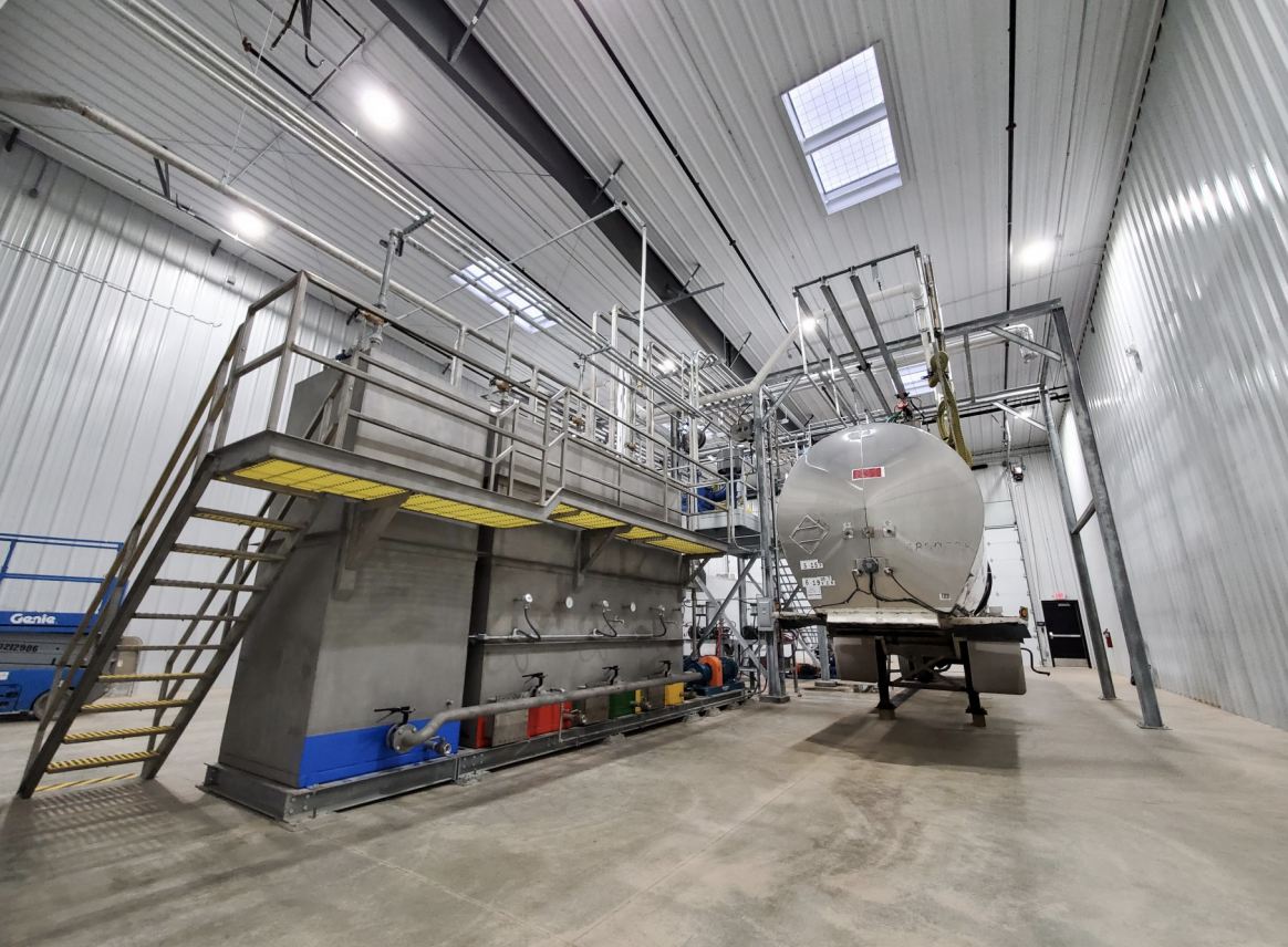 (This is a food grade cleaning bay. The oil bays are similar, just not as clean. The various pipes deliver cold water, hot water, cleaning solutions, and air for blowing dry. The overhead trolleys hold power washing equipment, hoses, and safety tethers.)