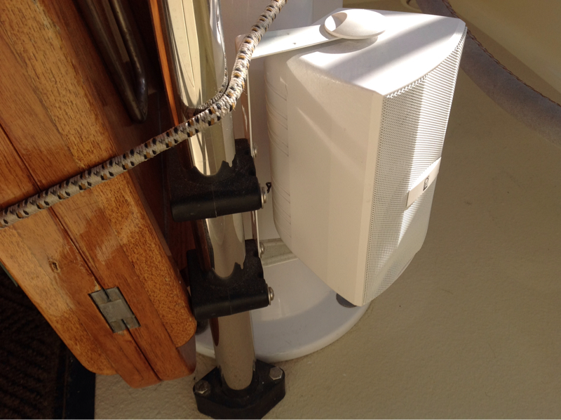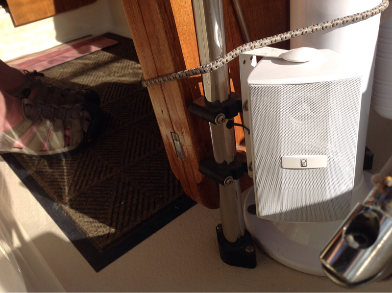 I took Phil's suggestion last year and installed the transducer drivers for speakers. I ran installed them in the lazarette on the back side of where I would have otherwise cut out speaker holes. I get sound that's nearly as good as the custom sealed enclosure 6.5" coaxial speakers installed in the cabin. They required absolutely no drilling or cutting, you cannot kick them in, they will not rot from the UV or weather (at least no faster than the rest of the boat), and they were cheap ($20ea!), and if you don't like them, peel them off!
