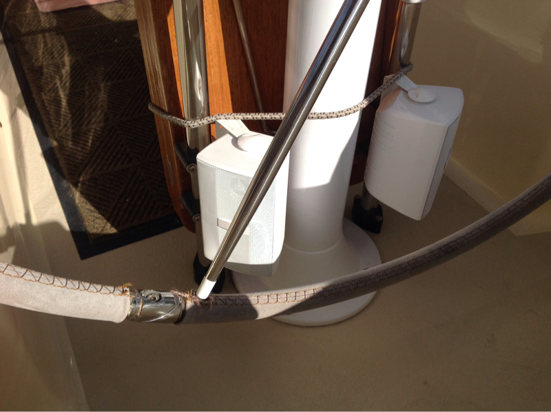 I went to the trouble of drill one hole from the lazerette into the void behind the rubrail. It's a direct run to the stereo. It was a little bit of a challenge, but worth it. I drilled a 1/2" hole behind the stereo, and then removed the AC outlet in that area for an access port during the project. I hate to have wires showing. I even hid the wires for the salon speakers which are fore and aft on the port side.
