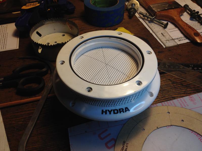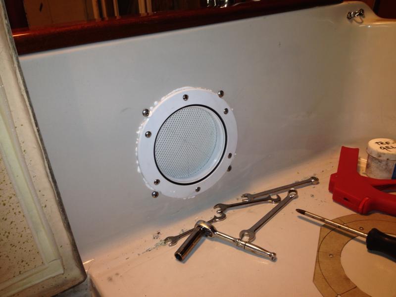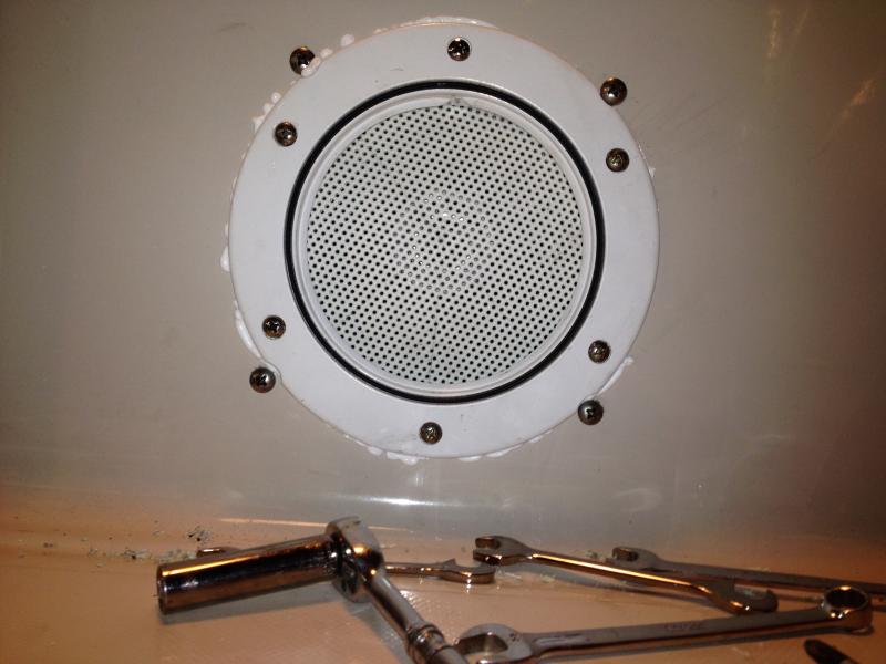 I had 2 access ports already installed for access to cleats and not wanting to cut any additional holes, I mounted speakers behind the ports. The 4 outside holes were for the speaker mounts. Tighten these evenly and gently to avoid distorting or cracking the speakers. The inside is out of view, otherwise I'd have figured out some covers. I like the plastic bowl idea, if covers were needed Nice to have water proof covers when not in use. I since have added ball chain to the port covers to avoid loosing them. Almost visible in the last photo. Installation did require some "boat yoga". robj p.s. the squeeze-out was later trimmed.