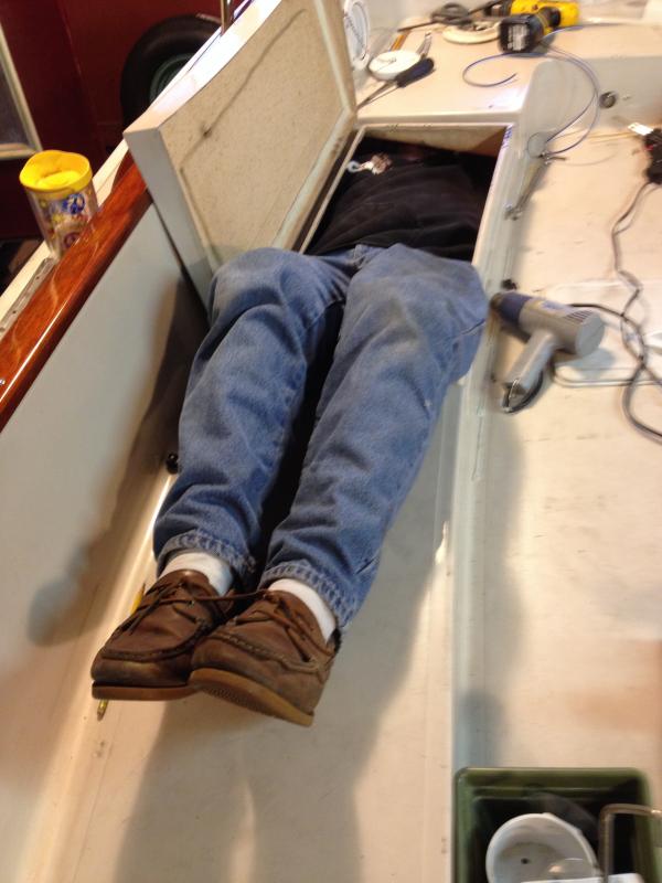 None of the wires show. They run from the aft locker into the starboard laz, under the aft birth and into the port cabinet in which I have mounted the radio facing the nav station.