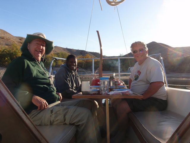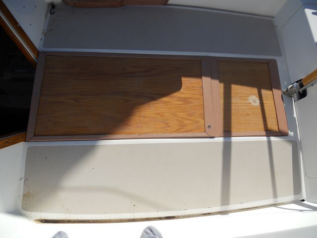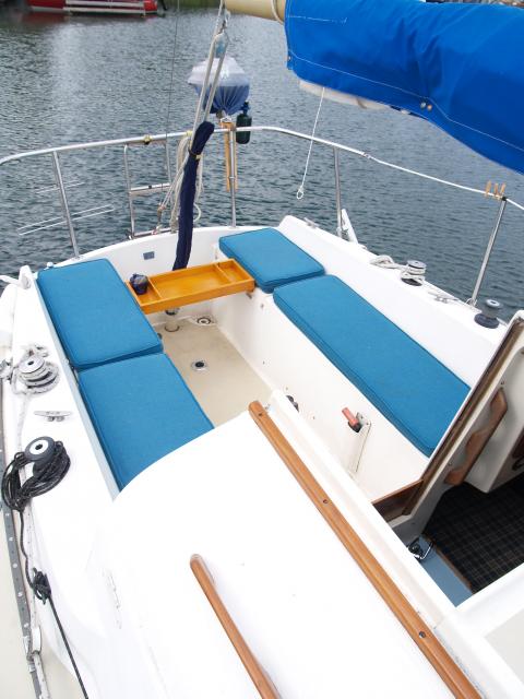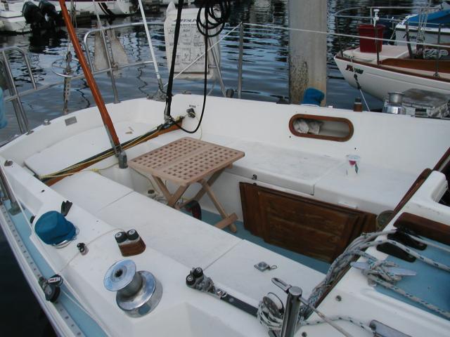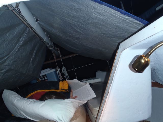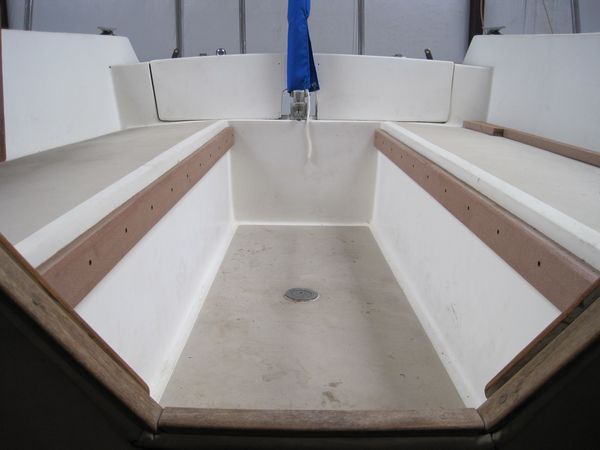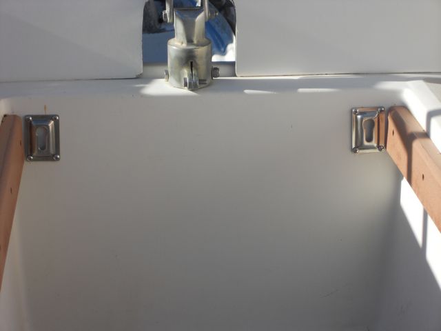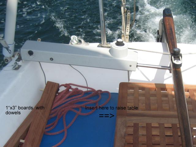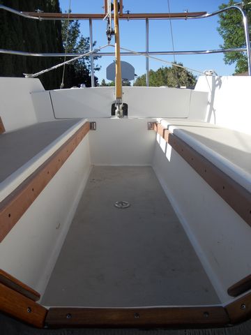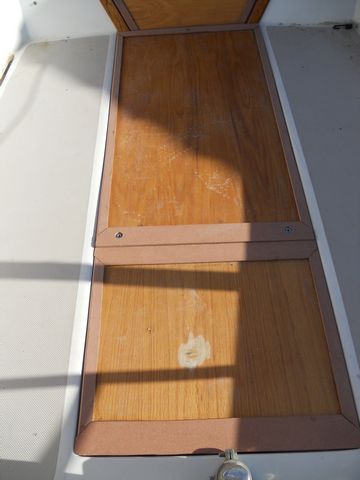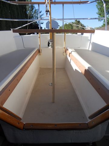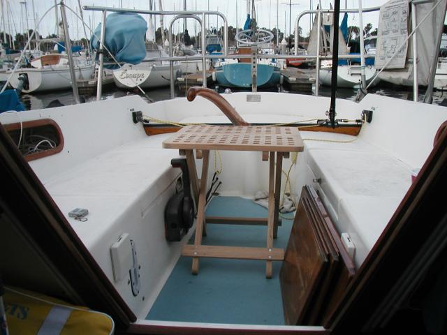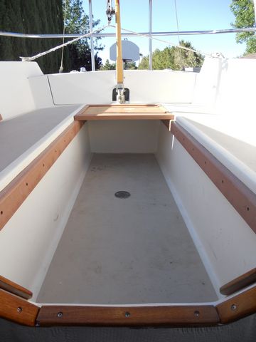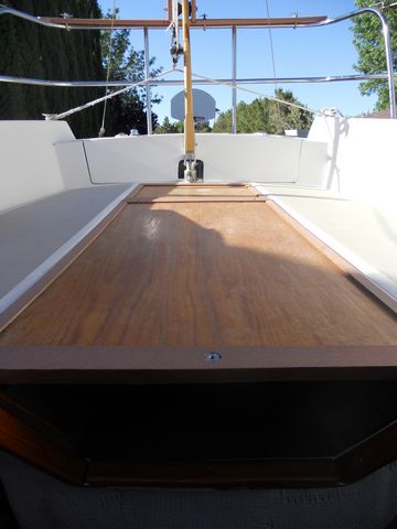 I also wanted to make a single surface in the cockpit for sleeping so I epoxied a couple of rails along the side. Then made two platforms...a smaller one that I use while sailing to put my chart book on top of etc and a longer one that becomes my table. I bolted a couple of key-hole brackets at the end of the cockpit that supports two legs and a third leg, forming a tripod is forward. All three legs screw into t-nuts, which are recessed into the top of the table. The table is made from 1/2" solid-core oak plywood and has a trex (synthetic decking) edge all around. I only have a couple of photos showing the rails, having breakfast on Lake Mojave with my son't former Boy Scout Troop, and my son reading before bed. But would take additional photos if you would like.