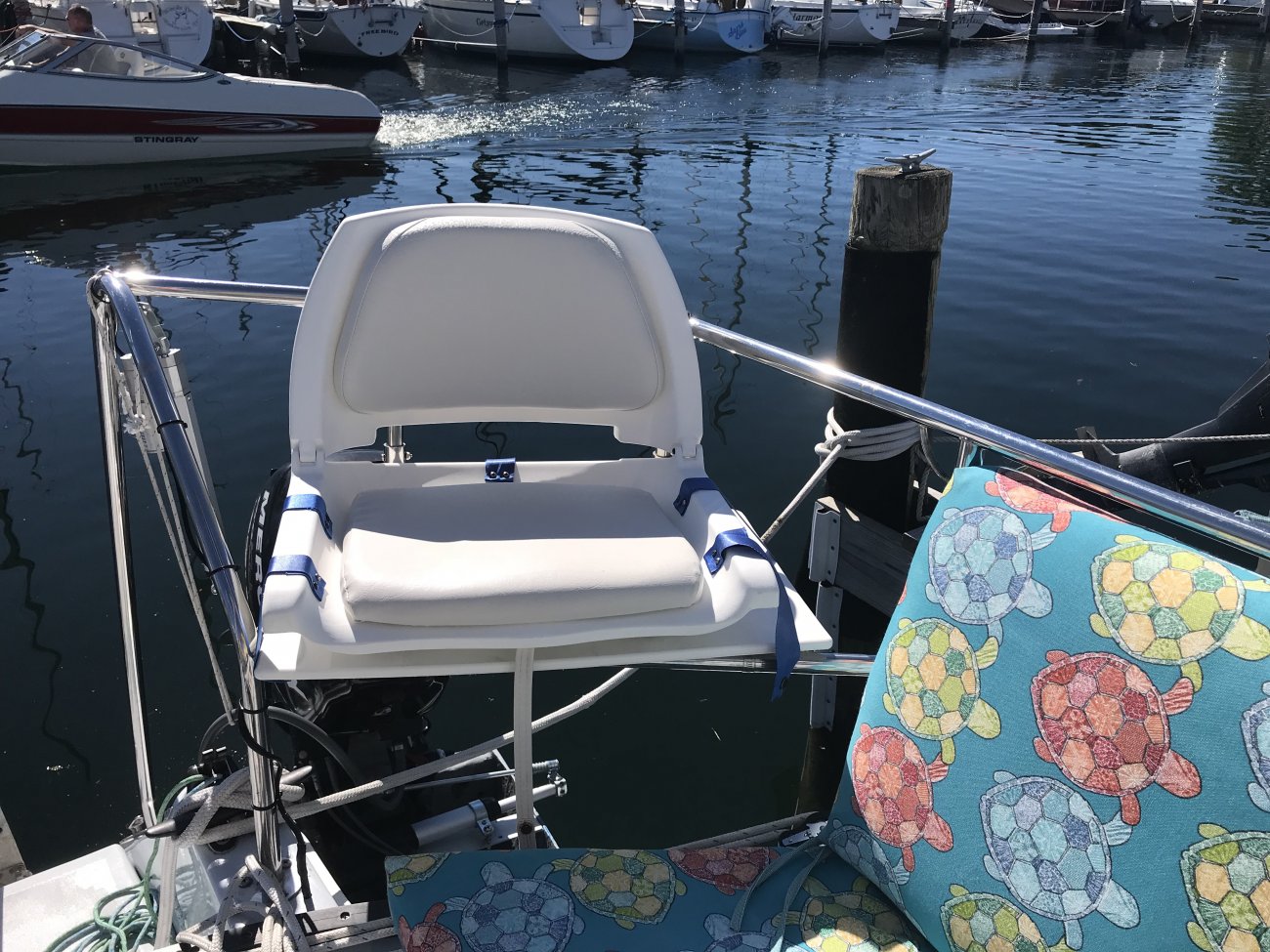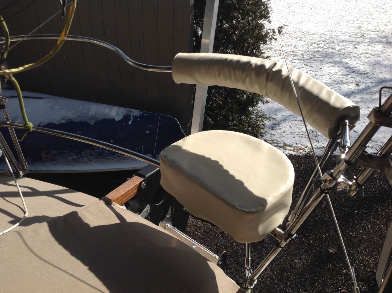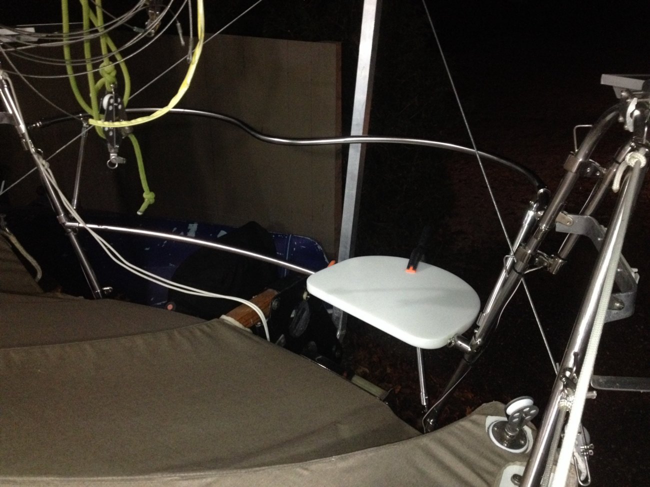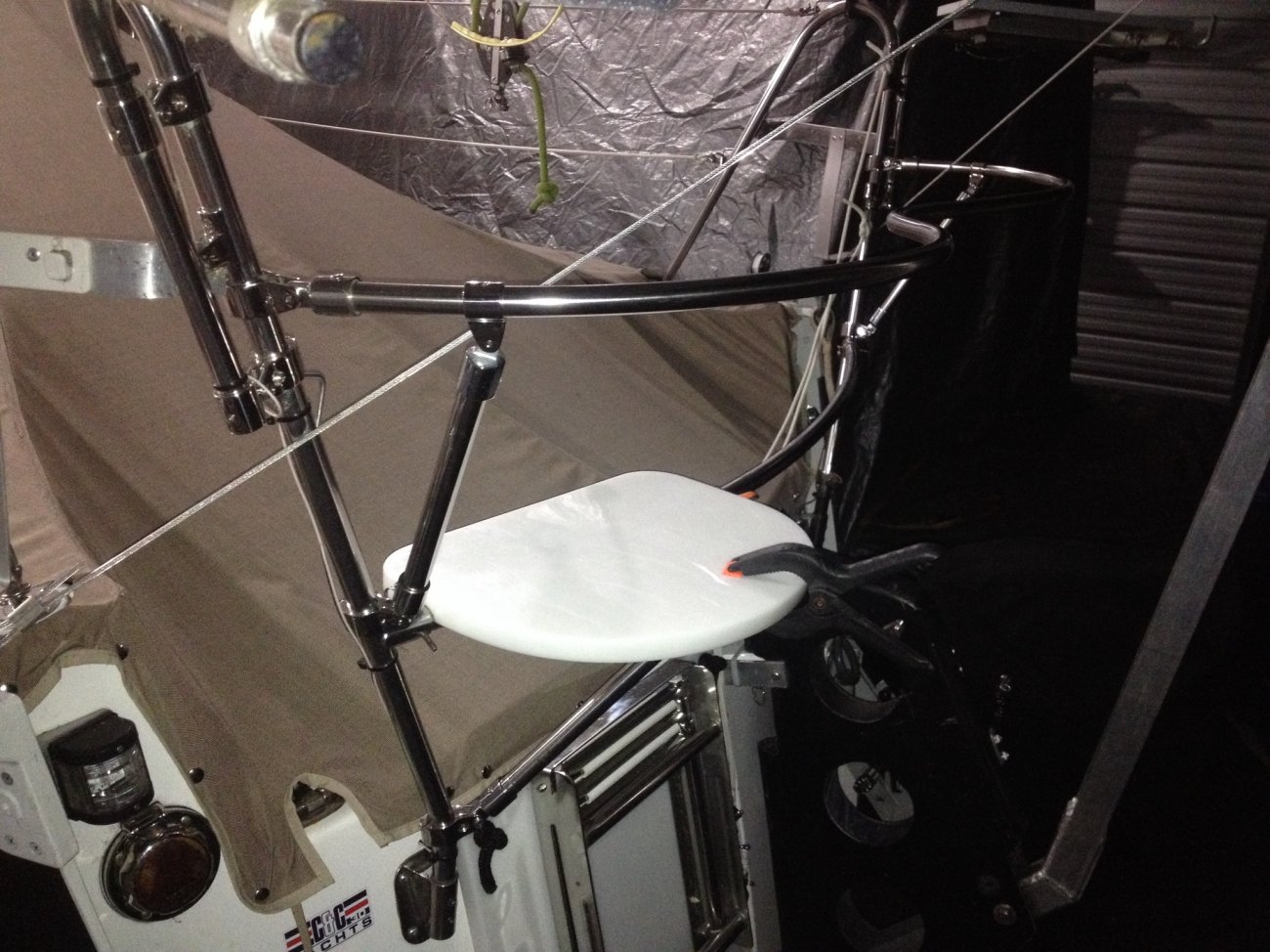 The seat, 1" HDPE Starboard (with 4" cushion to be made)...will slide from port to starboard as she chooses.