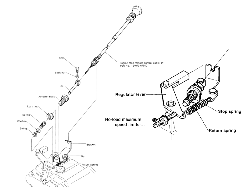 The return spring does not have to pull the throttle cable. What the drawing does not show is that the throttle control cable end has a slot that allows the regulator to move beyond idle to stop. Regarding the return spring: that spring is no longer available from Yanmar. No matter, you can find a suitable spring elsewhere. It need not be a robust spring as very little force is needed to pull the regulator past idle to stop after you have compressed the stop spring with your stop cable. The throttle control cable end should be adjusted so that there is free movement of the regulator arm at idle within the cable end slot. I do not think you should have to rotate the bracket from the factory position unless it has been moved to an odd spot. Once you get this right you will never have to look at it again and you will never stall while moving about the marina.
