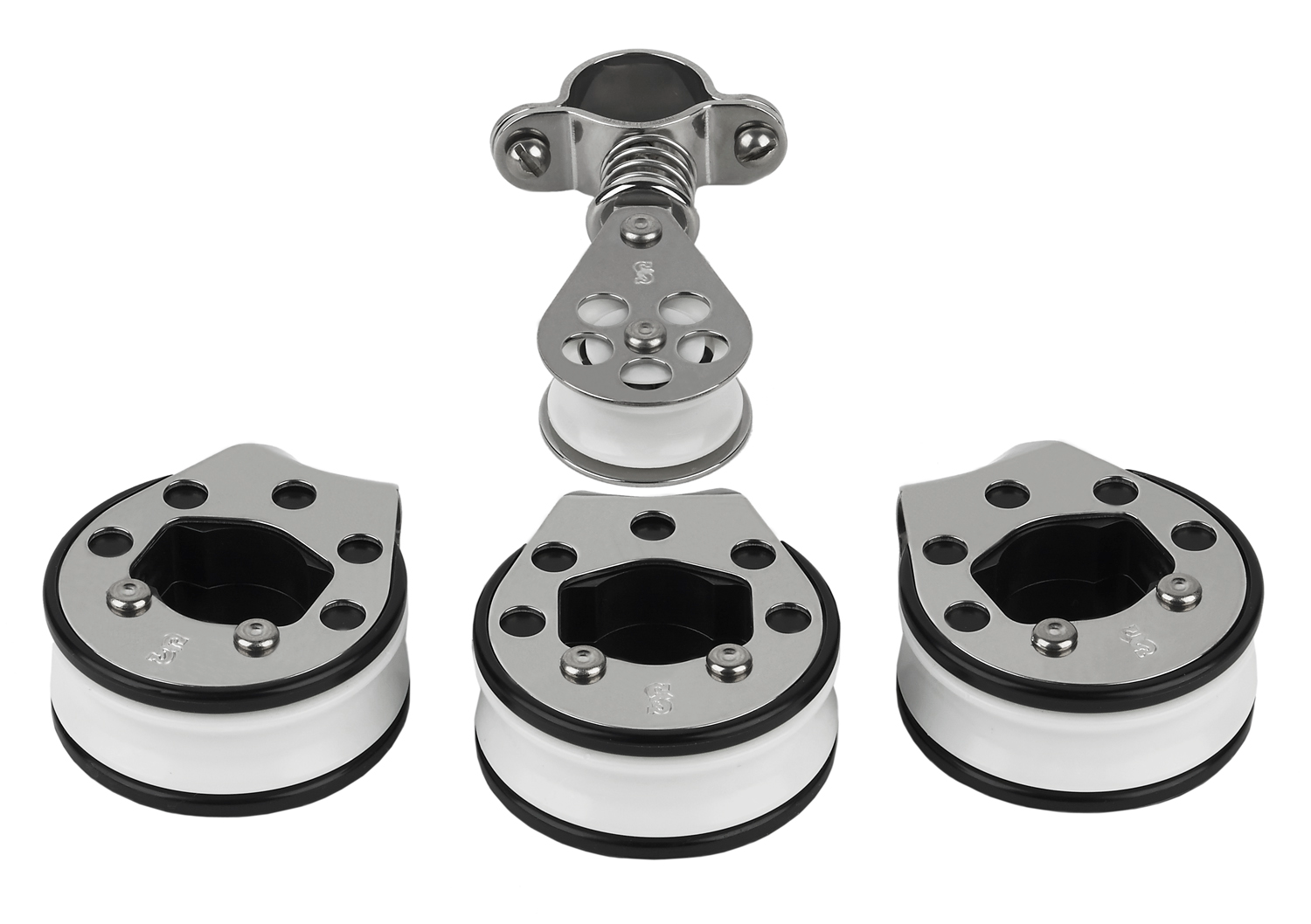 The stanchion blocks wrap around the stanchion. They are ran on the outside because of the curve of the boat. If I ran them on the inside, the line would rub against the "fairlead"/retainer on the block. If the spring block was ran on the outside, the line would push against the metal of the block and try to "collapse" or bend the spring. What is an acceptable distance between the spring block and spool?