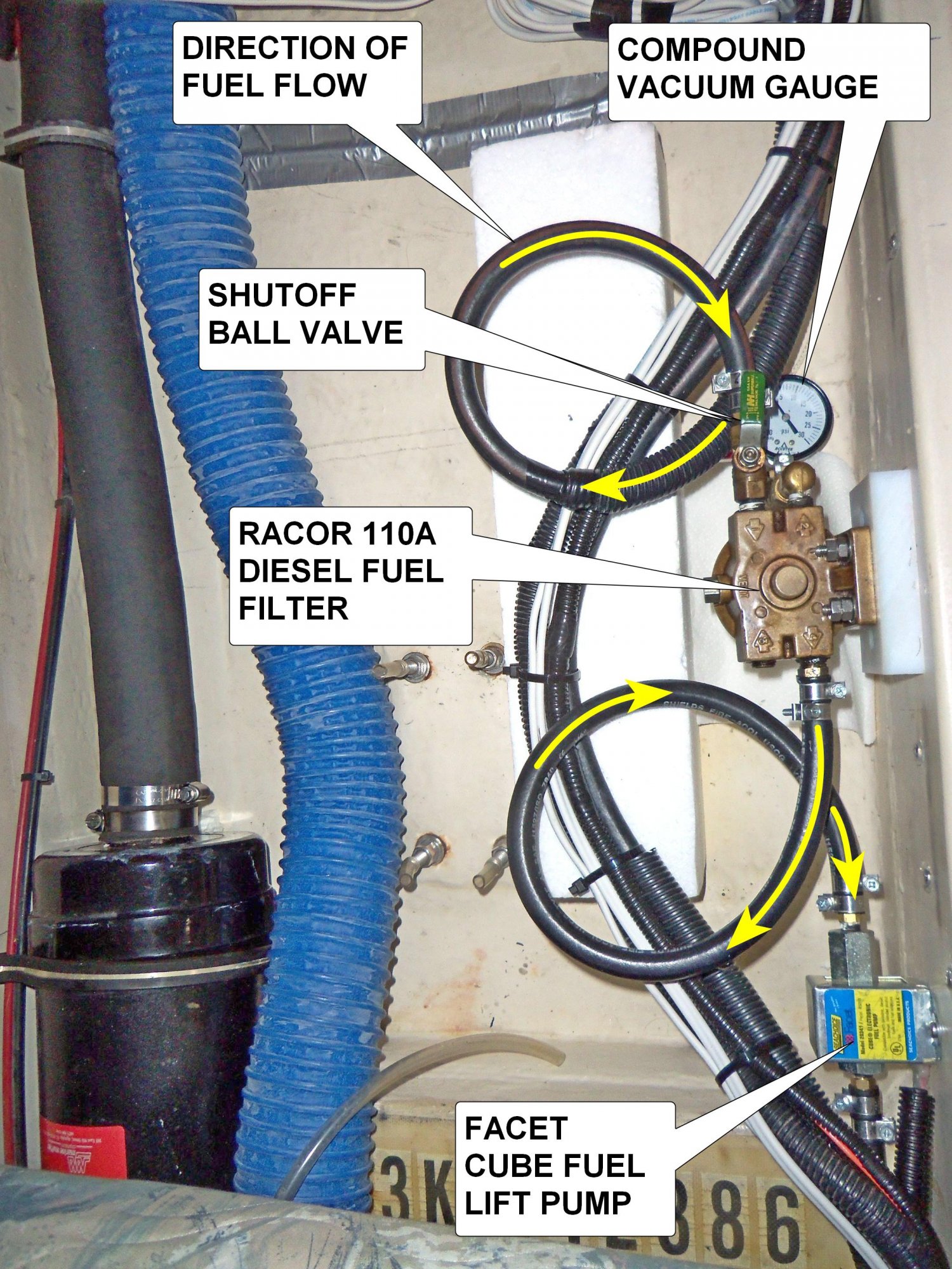 The Racor 110A fuel filter requies a few inches below it to remove the filter element. The factory installation located it within a run of tubing and electrical wires. A monumental undertaking trying to protect this mess while replacing the filter core :