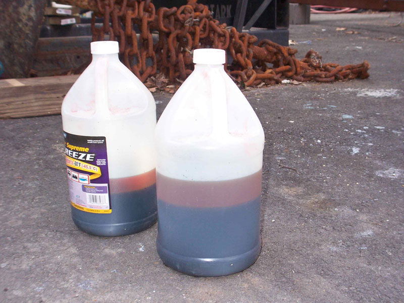 After about 10 years of this kind of use it became evident that the Atomic 4 was unhappy with the quality of the fuel it was getting so I pumped out the gas tank by hand. The picture above represents the last gallon or so I pumped out. I am fairly certain that our tank does not take on water from the fill cap. This is many years worth of phase separated alcohol absorbing water.