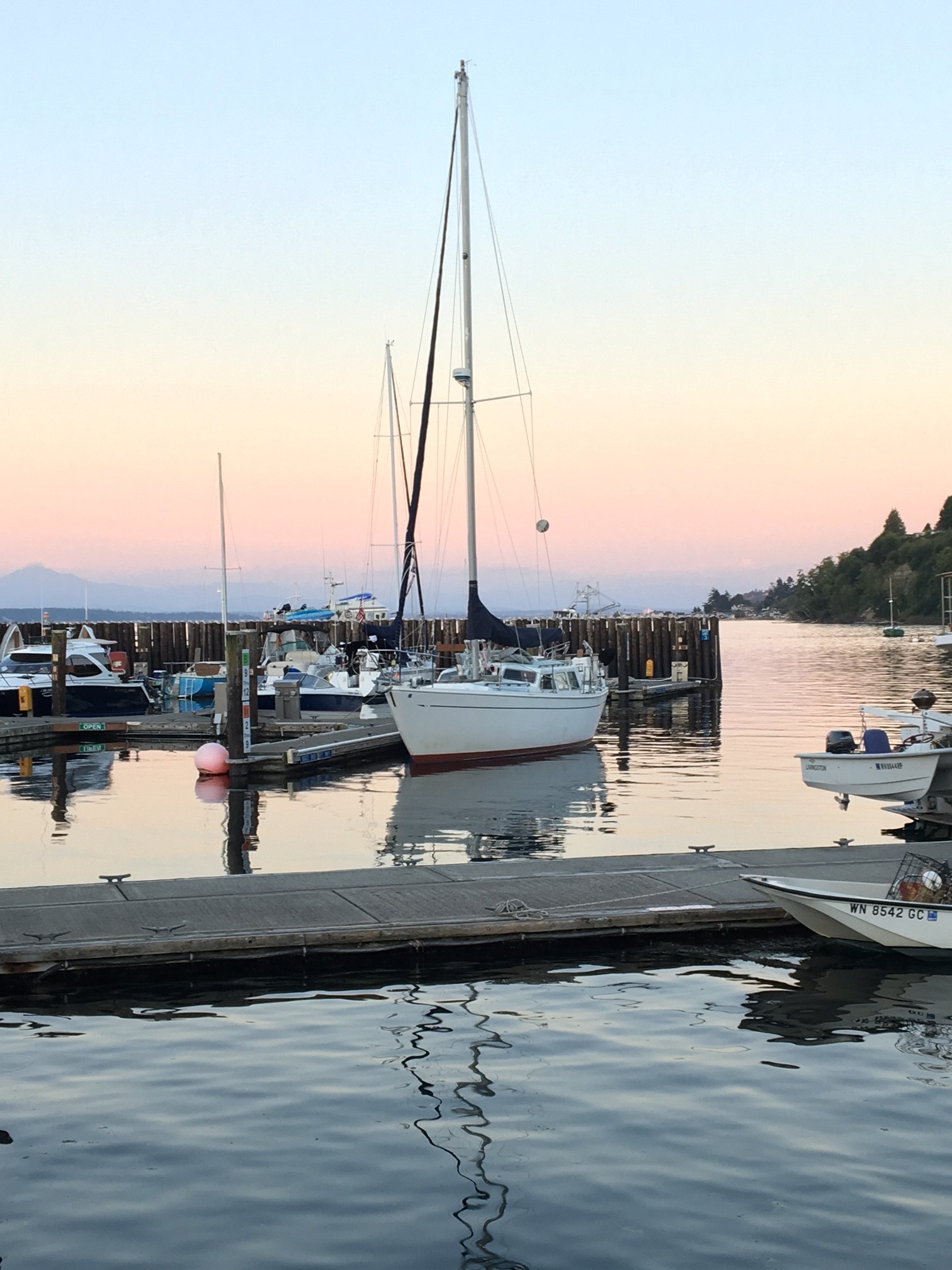 Hi John, one of my most favorite docking spots. Also, a very nice anchoring spot just outside the marina entrance.Wandering down the dock after a great dinner in Langley, WA, I smiled seeing my boat in the after glow of sunset coming down the Saratoga Passage.