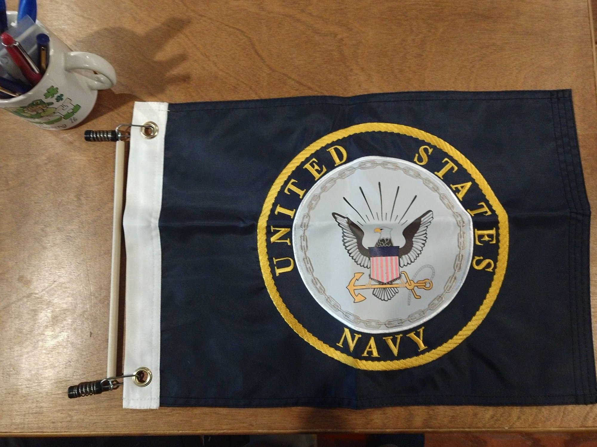 Having not yet rigged flag halyards on the Wet Dog I tried using flag clips that I purchased from Amazon ( DU-BRO Fishing Flag Clips for Halyards and Outriggers). I put them on the Starboard shroud with a Yacht Ensign. The only issues was after a time the clips would slowly come together and I would have to separate them using the boat hook. I made a spacer with a dowel stick and two eye screws. It works perfectly.View attachment 200728