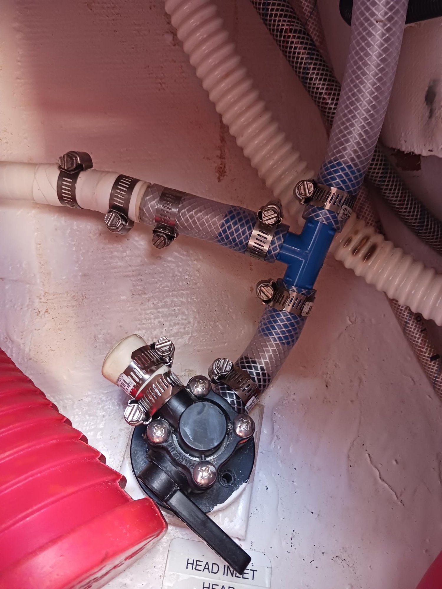Here's an easy mod to eliminate salt water in the holding tank. It only takes one 'T', one straight connector, a rubber cap, a couple of small pieces of hose, and a few hose clamps. All items are available at any hardware or big-box store. Now when you need to flush you just pump some water into the sink, and flush the bowl as you normally would. If you want to keep the holding tank even cleaner/fresher, you can just pour a mixture of water and head odor eliminating chemicals into the sink, and then flush with this.