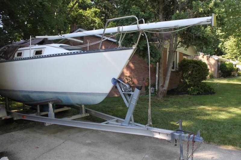 Its simple an 2 x 4 x 8 piece of wood attached to the forward upright steel post on the trailer that has a simple hardware store block on the top. If I thread the jib halyard(which I don't actually use) since the boat has roller furling, through the pulley wheel on the block, my wife,or any bystander can just lean back on the rope, and the mast comes right up. I do have baby stays to keep the mast from moving sideways. And the pulling up lineis high enough above the bow pulpit and everything else that it doesn't get tangled with anything.