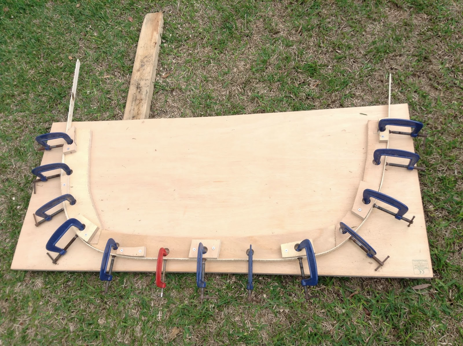 Nice progress on the hull. Why not use thin strips glued up into a laminate with epoxy with a plywood form? Easy to bend and clamp while it sets up, no hard spots in the bending process.