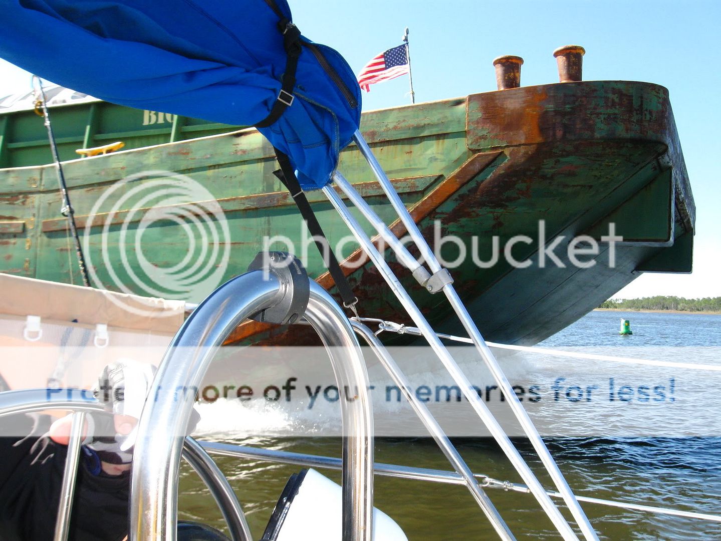 WOW they pass so close. As we exited West Bay and the channel funneled down into what appeared to be a single lane highway we had a huge barge (maybe not huge but it sure seemed so) come up from behind us. The fun part of this story actually occured 2 minutes prior to taking this photo...As we saw this barge bear down upon us I chose to hug the starboard side of the channell, well as luck would have it we ran aground and stopped dead in the water...can we say "OH $h!t"... ran below hailed the captain on Ch 16 and he replied that he would slow down. It was the longest 30 seconds as I reversed and finally broke free but not before the boat turned around completely and faced the barge (the rudder was stuck in the mud or something). With about 1 minute before he was on top of us I was able to turn the boat around and hold a straight coarse as he passed us. Whew, that was way too close.