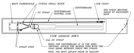 Keep in mind that once the centerboard is down you should attached a bungee to the bale that the pulley on the centerboard attaches to such that it will help hold the centerboard in the down position (or up, depending on how your boat is oriented after capsizing). Otherwise, you could be without the leverage needed to right the boat.