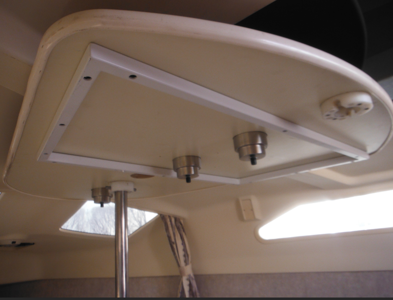 Now have three table positions: up on the ceiling, standard position and down for sleeping. Our table is heavy so moving it for set up is a chore - often leave it down for cruising and eat in the cockpit. Up (w/new cupholders):