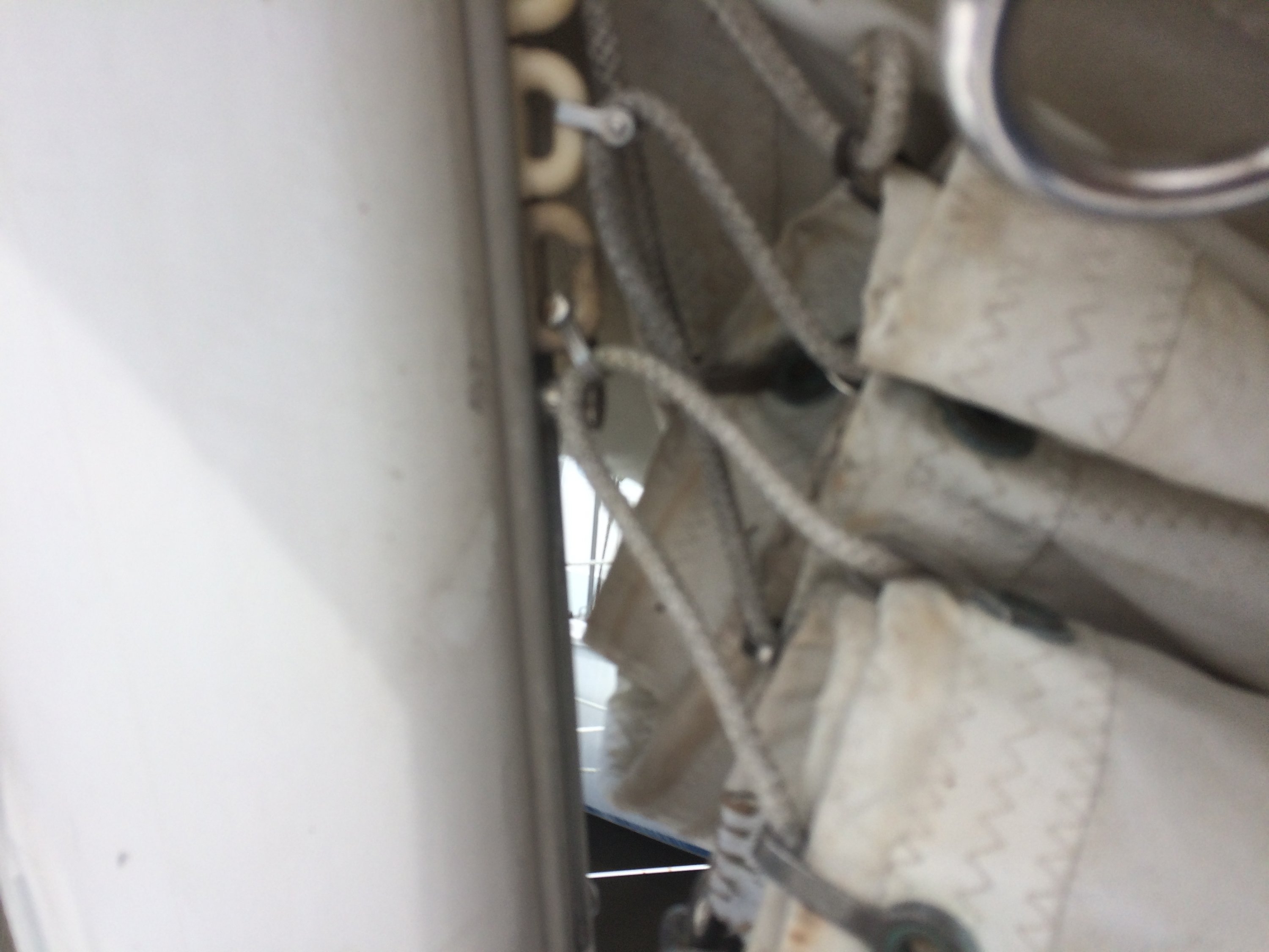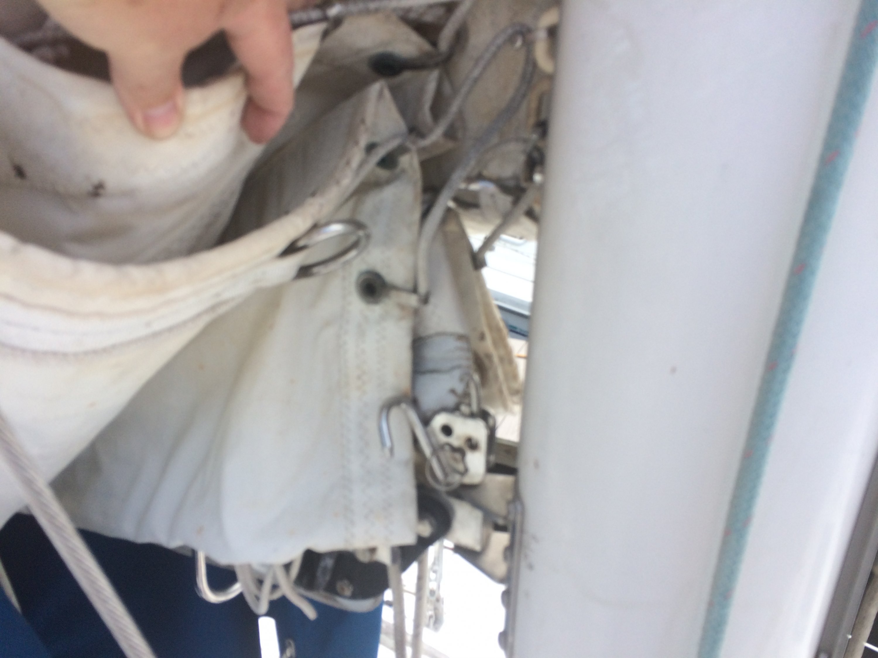Here's another couple of pictures of my old main sail jack lines. I removed the slugs for my mast mate. The po had the slugs between the gromets so not alot of movement. h-34 mainsail.jpg H-34 mainsail reefing.jpg