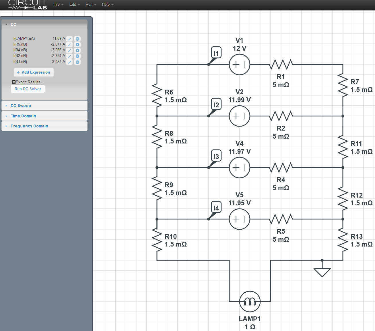 Undeterred by Circuit Lab's limitations I found an open source circuit simulator called Qucs and modeled more circuits. I can't say I fully understand @flightlead404's proposed configuration, so I built a circuit to match my own (sub-optimal) battery configuration. From the dealer our boat came with one house battery in the aft cabin and one in the engine compartment. All loads and grounds went straight to the aft cabin battery, with jumpers (maybe 10' of 2/0) to the one in the engine area. Knowing this was not a great situation every couple years I did a 20 hour load test on each battery and rotated them to try to keep them somewhat balanced. They always tested within 5% of each other and of their labeled capacity. Last year, after 7 seasons our house batteries abruptly went from performing quite well to totally dead (one with a bad cell, the other with 70% state of health). We took that opportunity to add a third battery in a nearby lazarette, about 12 feet of 2/0 away, just jumpered off the aft cabin battery.