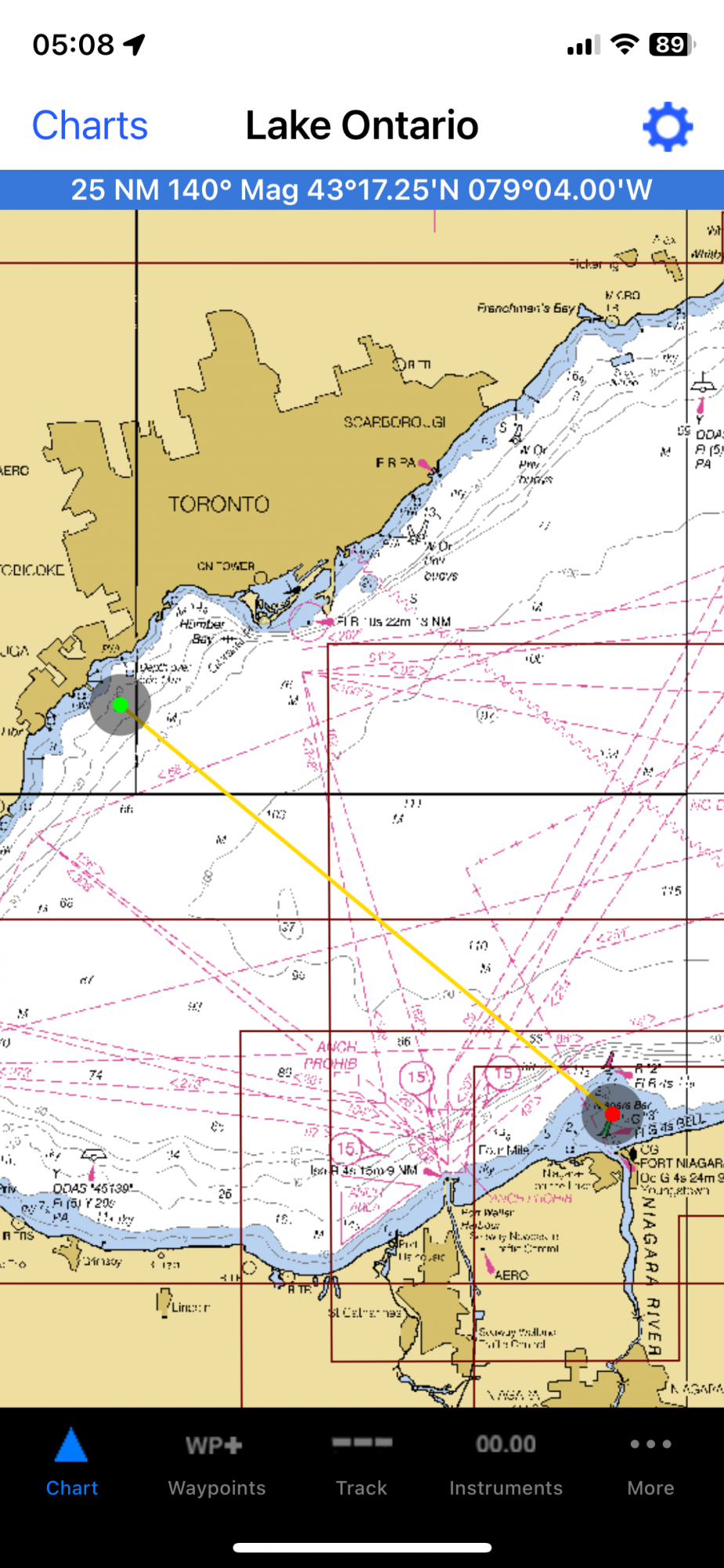 The good news is that none of this matters much. To make that trip in your boat, you need to be out when conditions are clear and winds are moderate. So, you should be able to spot landmarks the whole time. A useful skill to develop would be to take advantage of this fact to hone your triangulation skills. You should be able to shoot an azimuth to the CN Tower and another to Burlington Canal Bridge. Maybe Old Fort Niagara? With those two readings, you can pretty well pinpoint your location. You use periodic checks to adjust your heading.
