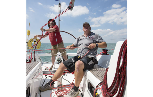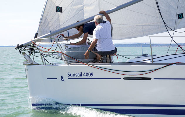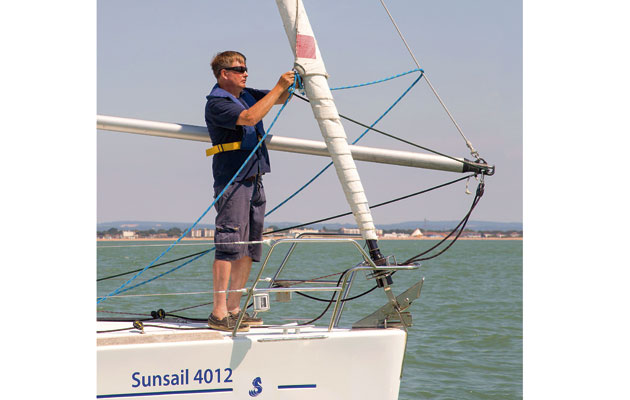 3 With the pole height set, Mark hauls on the third sheet to unfurl the genoa