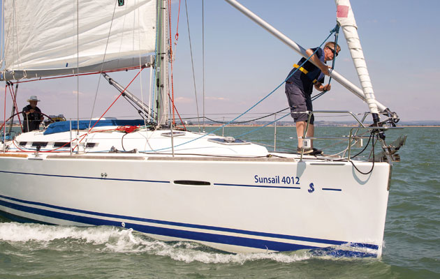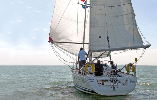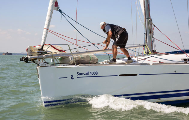 After a laboured first gybe, our technique improved rapidly. As the boat heads down, the old sheet is eased until the clew is just forward of the forestay, then the new one is hauled in. Steer dead downwind until the clew is round the forestay. Watch the clew or mark the sheets so that you know when you’ve eased enough.
