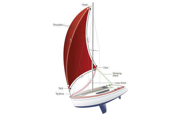 A cruising chute, also known as an asymmetric spinnaker, is one that has its tack and clew at different heights. The sail flies from a bowsprit, projecting the sail’s tack beyond the pulpit so that its foot doesn’t foul. As its tack is on the centerline, sailing dead downwind isn’t ideal because the main pretty much blankets the entire sail.