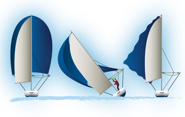 A symmetrical spinnaker is used as both an aerodynamic sail when reaching, with air flowing across it like a foil and creating lift, and also as a windjammer, simply blocking the wind when heading deeper and dead downwind.