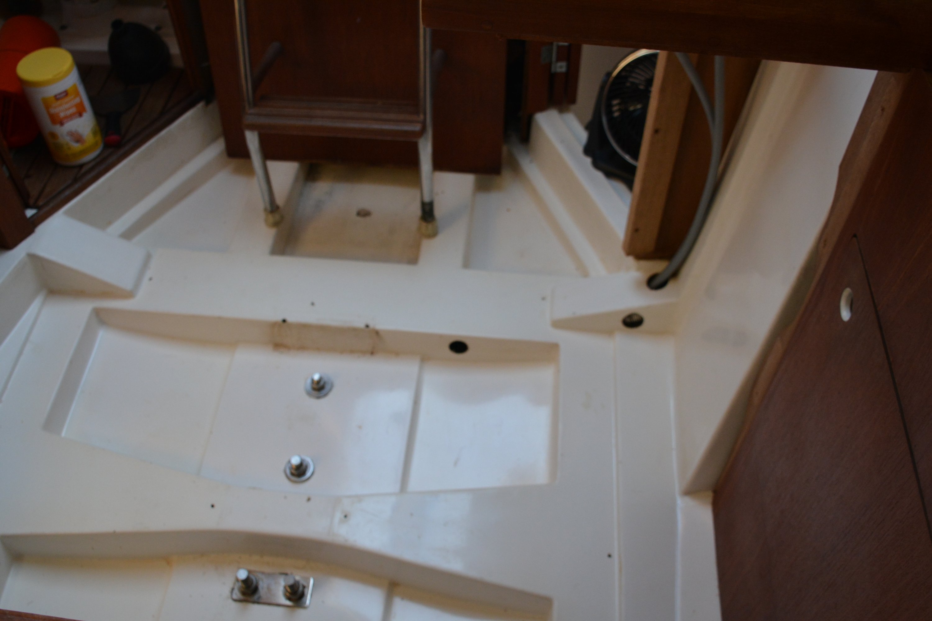On the ledge surrounding the bilge is a tiny hole... a weepy hole... takes about 15 minutes for the dirty looking water to eak itself out in the amount you see in the pic here.