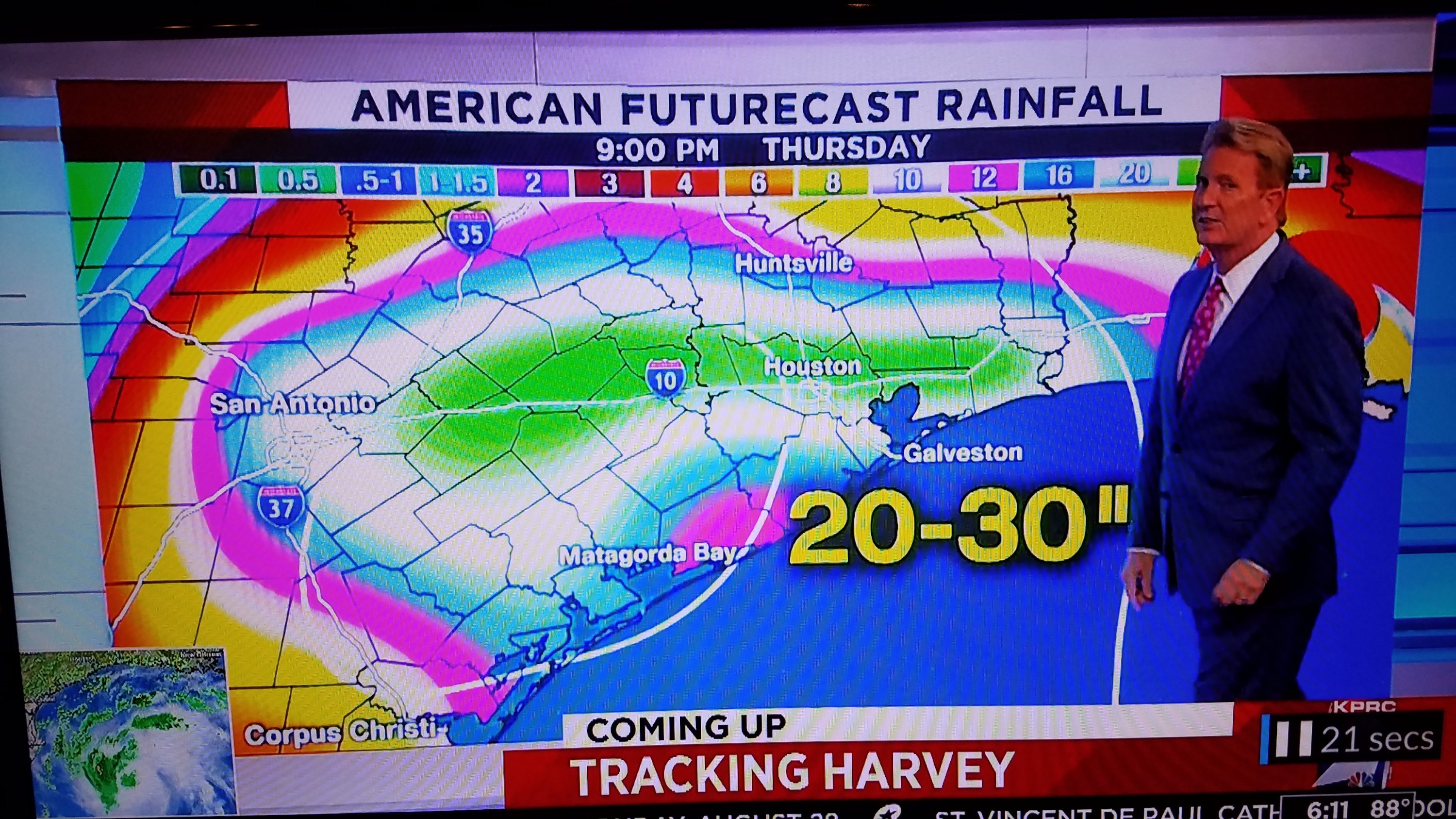Weather man was wrong again with their 20 to 30" rainfall forecast. We only got 51.88 inches at the Cedar Bayou gauge upstream of my house.Latest update from Houston, rain of biblical proportions! TV news just reported latest models shows a band of 20 to 30" totals of rain predicted for the next few days between Houston and San Antonio. Hopefully it's hype for ratings. Landfall predicted as cat 3 near Rockport.