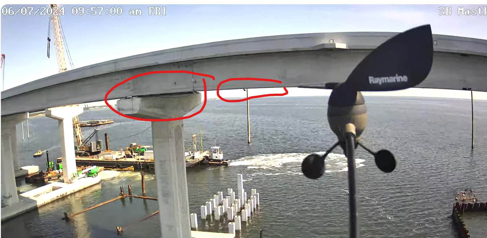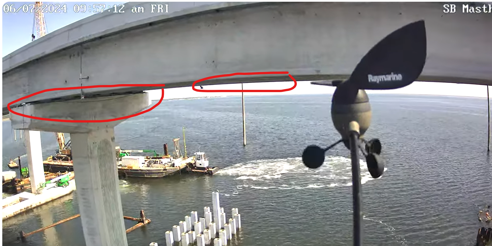 I circled these in the first 2 images below of the Addison Point NASA Causeway bridge. The 3rd image has an arrow showing under-bridge detail of the bridge, but at that point we were VERY close - and reversing would have required strong reverse-throttle to avoid going under (even though we were going slow).
