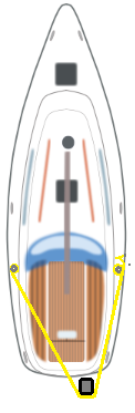 This would use a combination of a transom saver saver support bracket from below (roughly drawn in red) and a harness that I would strap to the stern railing above (roughly drawn in purple).