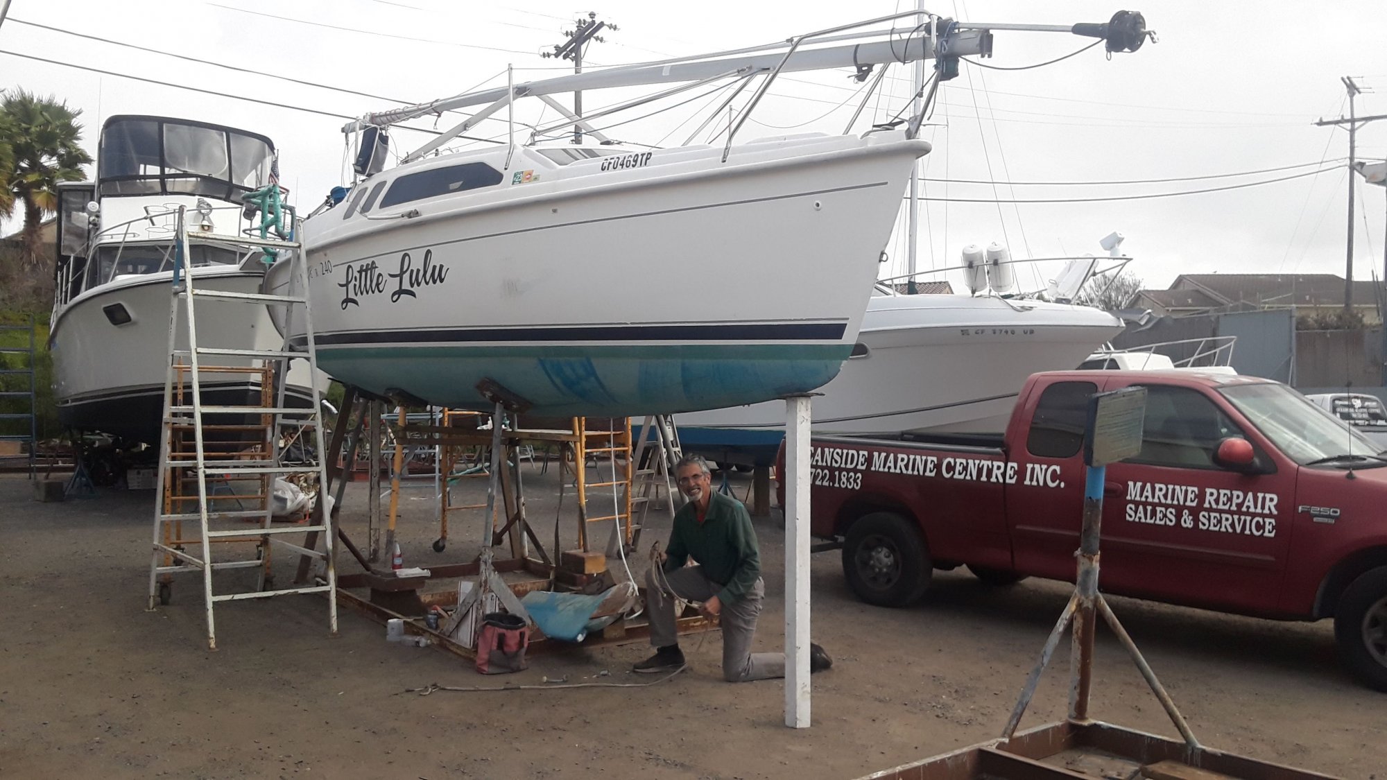 Yea! Successfully installed stern rails/seats and replaced centerboard lift line on my Hunter 240 at the Oceanside Marine Centre boat yard.
