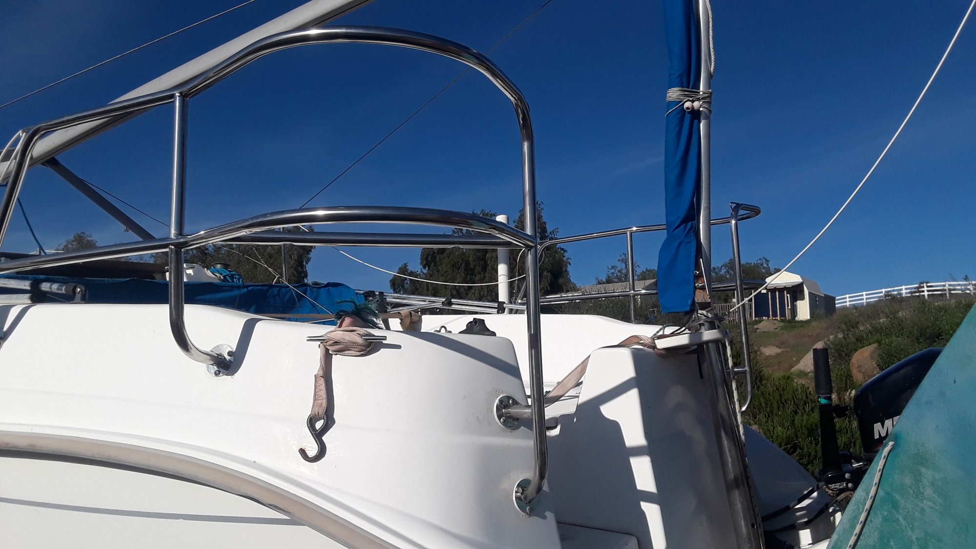 Spent a week working and socializing with other sailing enthusiasts! Great guys and very friendly atmosphere. I became a boat yard "bum" sleeping on my truck bed and in the boat for a week. Replaced the lift with dyneema so I won't have to pay $324 to put my boat on stands again. Broke a tap while installing the stern rails and replaced it with an oversize bolt. Now my boat is ready to sail to Catalina and beyond!