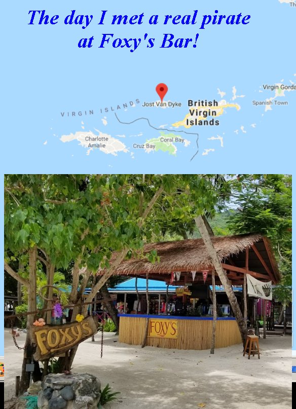 I met a real, honest to goodness, pirate once. He had the whole thing, eye patch, hook for a hand and peg leg. I mean salty, 'ARG!' Kind of pirate. This was at Foxy's in Jost Van Dyke. So, after telling me about how Jost Van Dyke got its name, I asked him, "Not to be rude, but do you mind telling me how'd you loose your leg?"