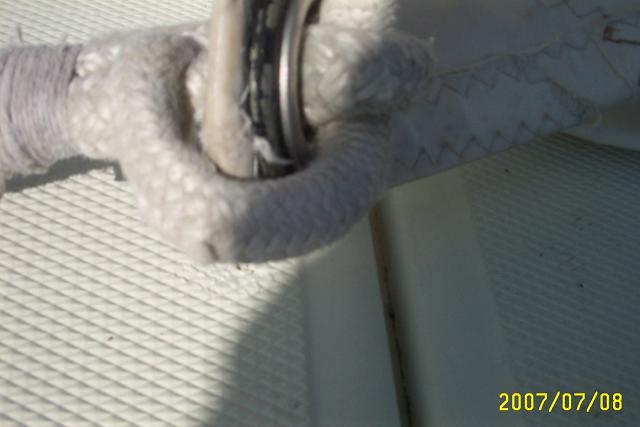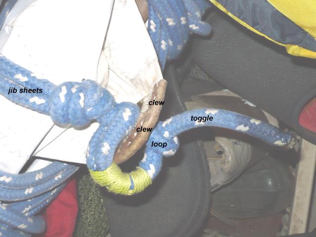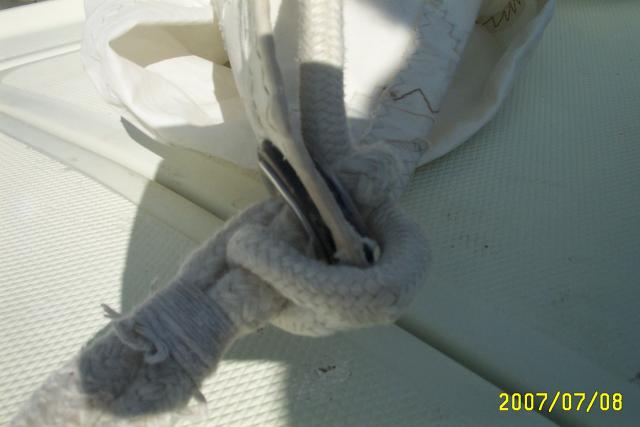 My apologies for revitalizing this thread, as I did not get a answer to my query as to the type of knot I use for my sheet attachment. Attached is a picture that I finally found yesterday. I have seen this arrangement rarely, as cow hitches, larks heads and bowlines seem to predominate.
